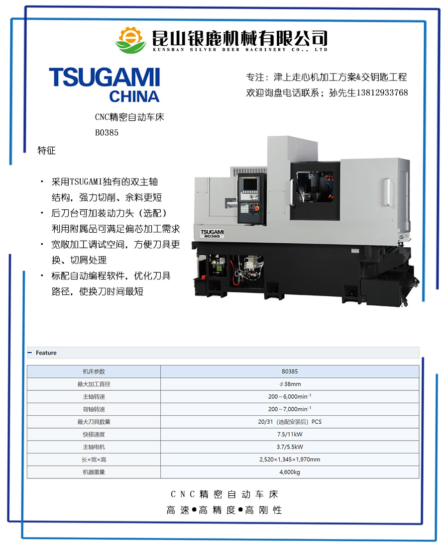 津上目前在產(chǎn)最大直徑之走心機(jī),適用直徑8-38mm,主軸7.5-11KW電機(jī),背軸3.7/5.5KW,配套剛性高。對(duì)長(zhǎng)軸類大直徑產(chǎn)品實(shí)現(xiàn)自動(dòng)化批量加工。機(jī)床整體重達(dá)4600kg;比較專業(yè)細(xì)節(jié)的部分,面談。