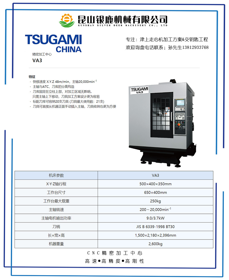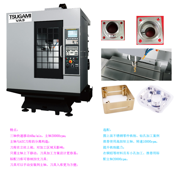 日本津上秉持專業開拓的鉆攻中心系列,刀臂式刀庫20刀位,BT30主軸20000rpm,主軸功率3.7/9KW,三軸快移48m/min,高速換刀0.8秒(刀到刀),工作臺650*400mm,可最大承重250kg。